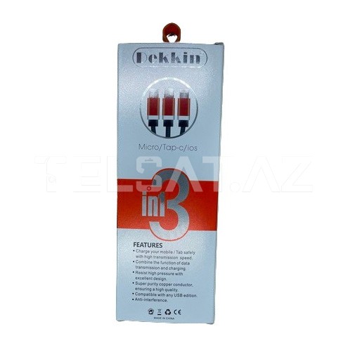 Dekkin DK-A43 3 in 1 Kabel, çeşitli cihazları eyni anda şarj etmək və məlumatları köçürmək üçün effektiv bir seçimdir. Bu kabel, Lightning, Micro USB və USB Type-C portlarına sahib cihazları dəstəkləyir.