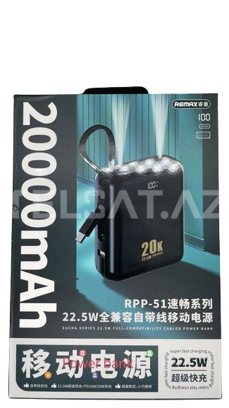 Remax RPP-51, geniş 20000mAh batareya kapasitesi və 22.5W sürətli şarj təmin edən güc bankası ilə diqqəti cəlb edir. Tam uyğunluq kabelləri ilə təchiz olunmuş bu power bank, müxtəlif cihazları rahatlıqla şarj etmək üçün effektiv bir seçimdir.